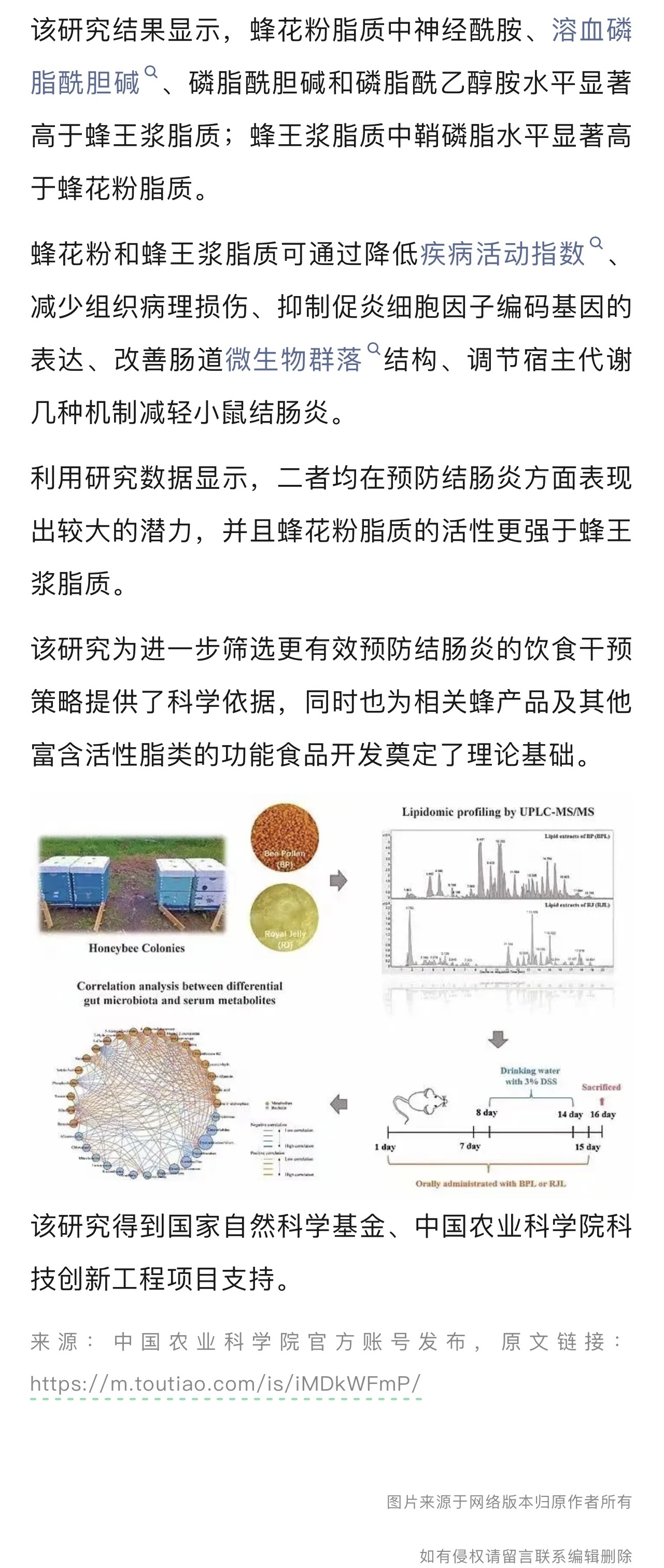 中國農業科學院蜜蜂研究所揭示:蜂花粉和蜂王漿對結腸炎具有較大潛力