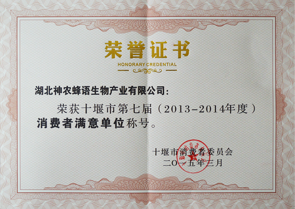 今年3·15,十堰市消費者委員會在Q市范圍內組織開展的十堰市第七屆“消費者滿意單位”、“消費者滿意商品”評選活動揭曉,湖北神農蜂語生物產業有限公司榮獲2013-2014年度“消費者滿意單位”。