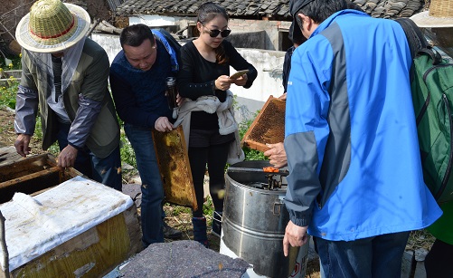 跟著小蜜蜂回到蜂場,看到一排排整齊的蜂箱,好奇的蜂友們都想一窺箱內乾坤。養蜂人朱師傅便打開蜂箱,一股清甜的油菜花蜜味迎面襲來,箱內滿是密密麻麻、有條不紊勞作著的蜜蜂們,釀造的釀造、出勤的出勤,蜂王則忙著產卵培育新兵……在它們的辛勤勞動下,已經有晶亮濃稠的蜂蜜釀造了出來,惹人垂涎,朱師傅掰下幾塊巢脾蜜給蜂友品嘗,這新鮮香濃的春天味道,真是讓人欲罷不能??!