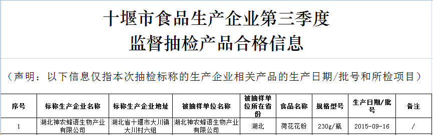 近日,省食品藥品監督管理局開展了十堰市食品生產企業監督抽檢。12月1日湖北省食品藥品監督管理局公布了抽檢情況,湖北神農蜂語生物產業有限公司的蜂產品荷花粉經過隨機抽檢檢驗,合格。