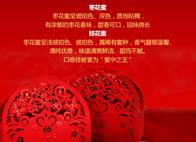 因為是一生中重要的時刻,每樣禮品都是為錦上添花而來。神農蜂語喜蜜,包裝選取進口食用級木漿紙,選用中國紅色外包裝。采用中式鏤空雕花,J致又不失大氣,美麗又寓意美好,給每一個收到的人一份Z真誠吉祥的祝福!