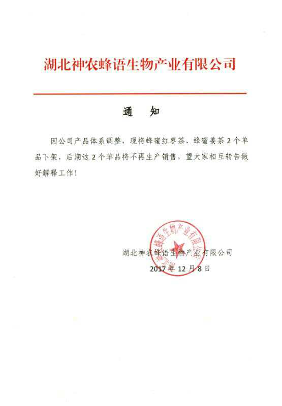 因公司產品體系調整,現將蜂蜜紅棗茶、蜂蜜姜茶2個單品下架,后期這2個單品將不再生產銷售,希望廣大用戶相互轉告。以下為文件掃描件。