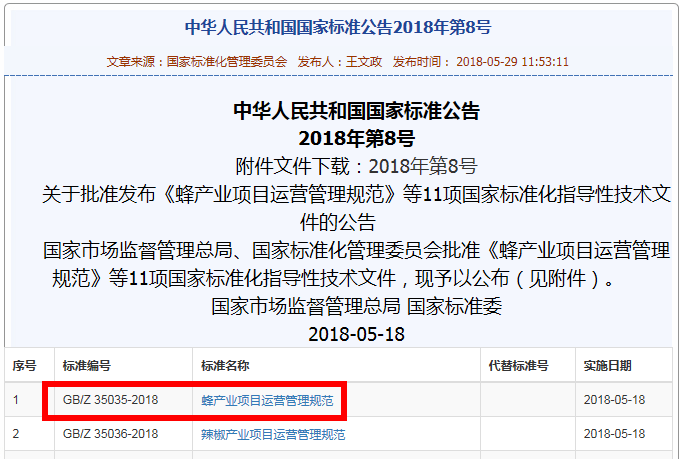 近日,國家市場監督管理總局、國家標準委正式發布中華人民共和國國家標準公告2018年第8號公告,《蜂產業項目運營管理規范》等11項國家標準化指導性技術文件予以公布,并于2018年5月18日實施。