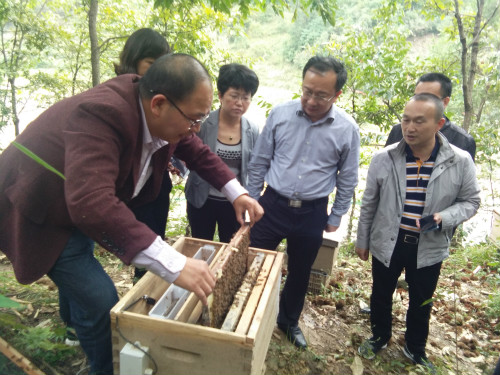 中共十堰市委書記張維國(右一)到鄖西六郎考察指導蜂產業扶貧工作