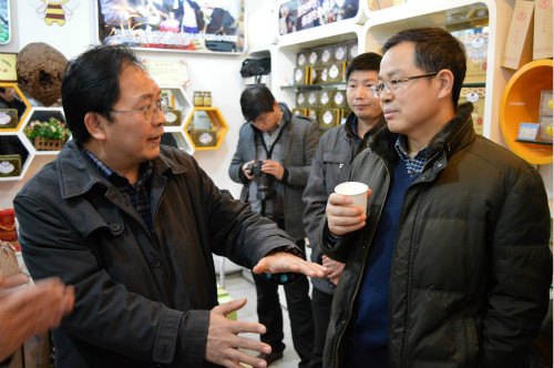中國蜂產品協會副會長趙小川(左)到神農蜂語專賣店指導工作